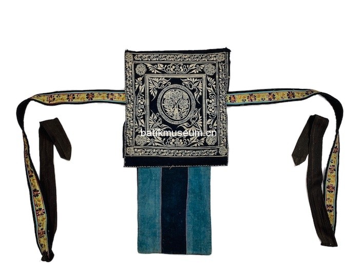 中文名:贵州省黔南布依族苗族自治州惠水布依族太阳花月亮花星星蝴蝶纹双色枫香染蓝青手织布双层背扇