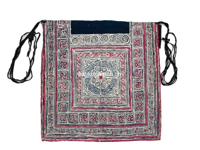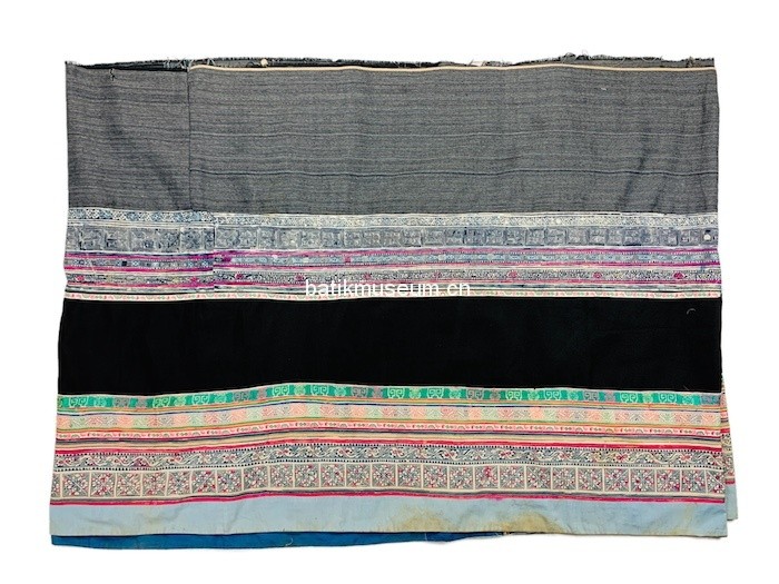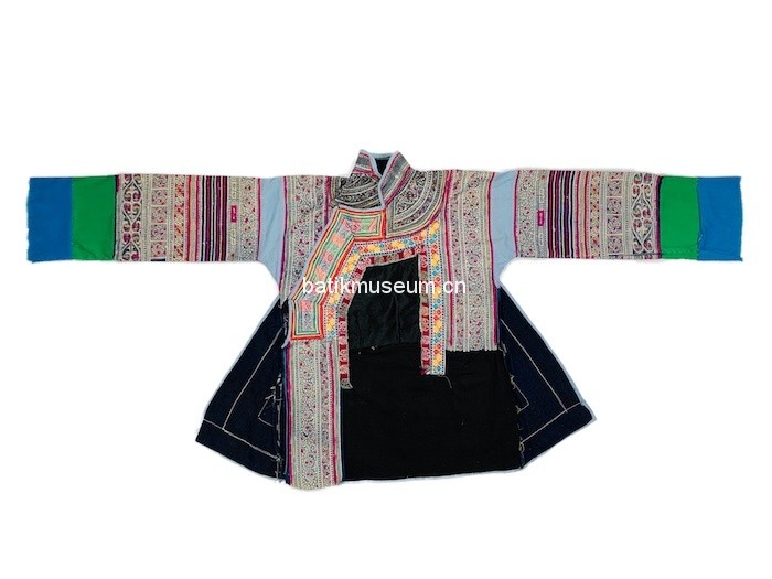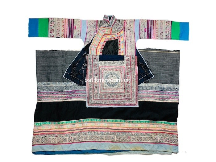 中文名:贵州省毕节市大方苗族变形斜角云几何花卉纹彩色蜡染挑花大襟右衽立领长袖衣/雷云几何花卉纹彩色蜡染挑花长筒裙/变形斜角云几何花卉纹彩色蜡染围腰