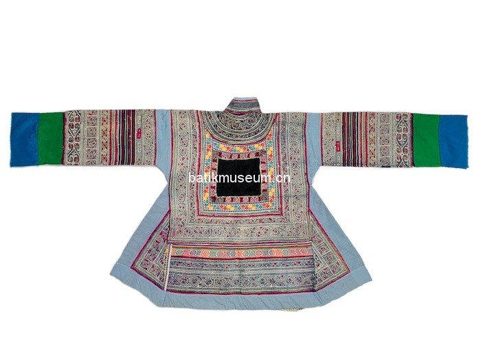 中文名:贵州省毕节市大方苗族变形斜角云几何花卉纹彩色蜡染挑花大襟右衽立领长袖衣