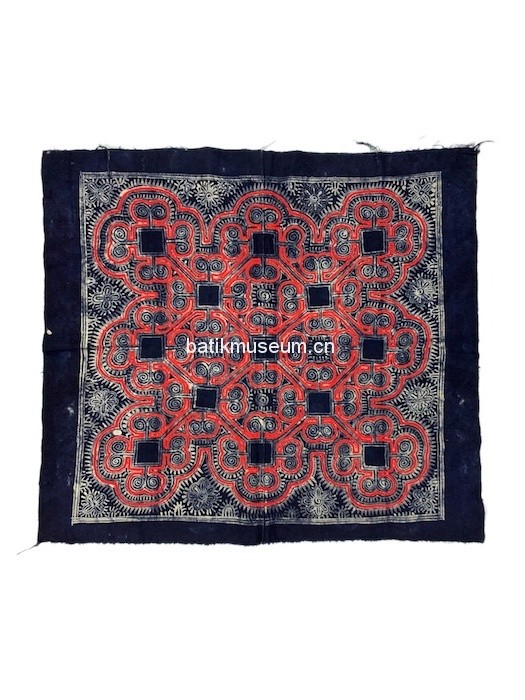 中文名:四川省宜宾市珙县苗族牛头漩涡太阳几何花卉纹蜡染刺绣背扇片
