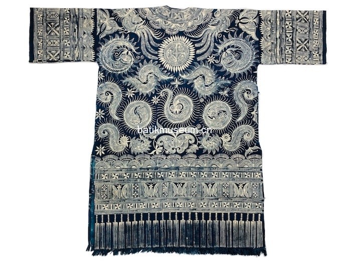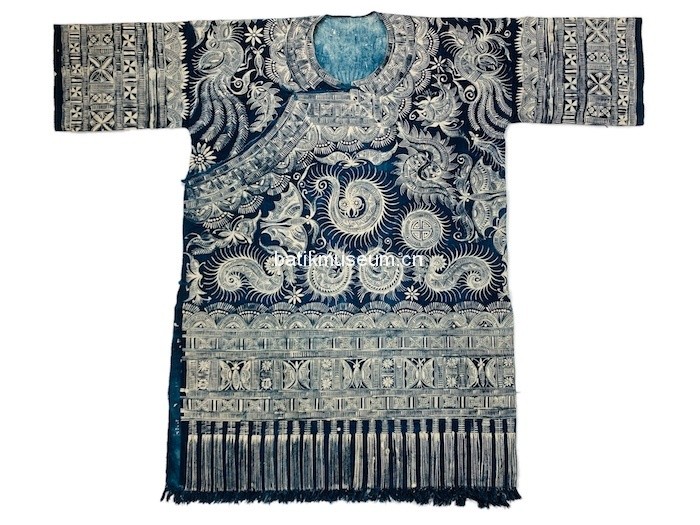 中文名:贵州省黔东南苗族侗族自治州榕江苗族龙鸟鱼蝶铜鼓花卉几何纹蜡染大襟右衽长袍