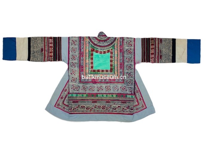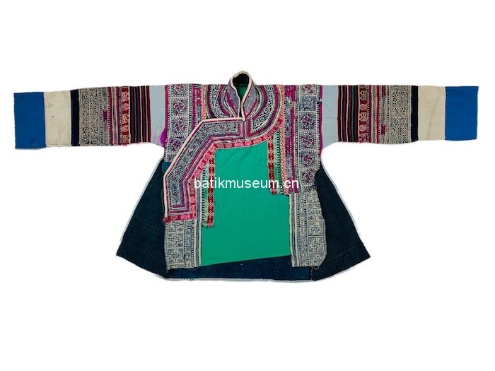 中文名:贵州省毕节市大方苗族变形斜角云花卉几何纹彩色蜡染手织麻布大襟右衽立领长袖衣