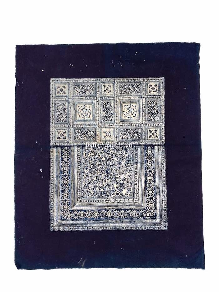 中文名:贵州省毕节市黔西苗族牛头神鸟花花卉几何纹双色蜡染背扇
