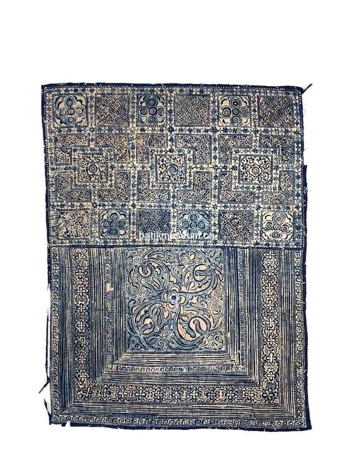 中文名:贵州省毕节市黔西苗族牛头神鸟花花卉几何纹双色蜡染彩色背扇