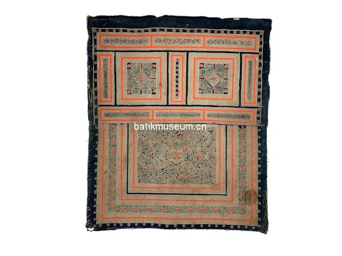 中文名:贵州省毕节市织金青蛙变形鸟几何纹蜡染背扇