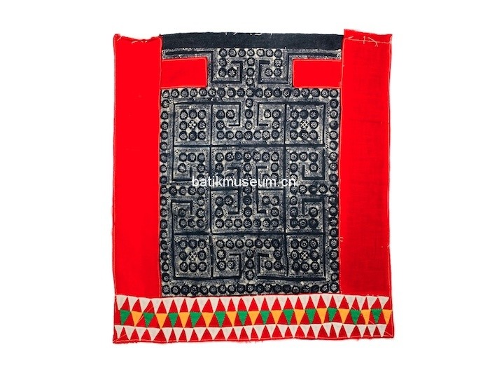 中文名:贵州省毕节市大方苗族白苗三角贴布绣太阳点状几何纹蜡染背扇片