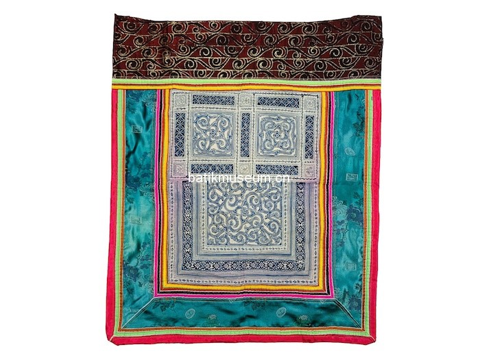中文名:贵州黔西苗族牛头神鸟花花卉几何纹双色蜡染背扇