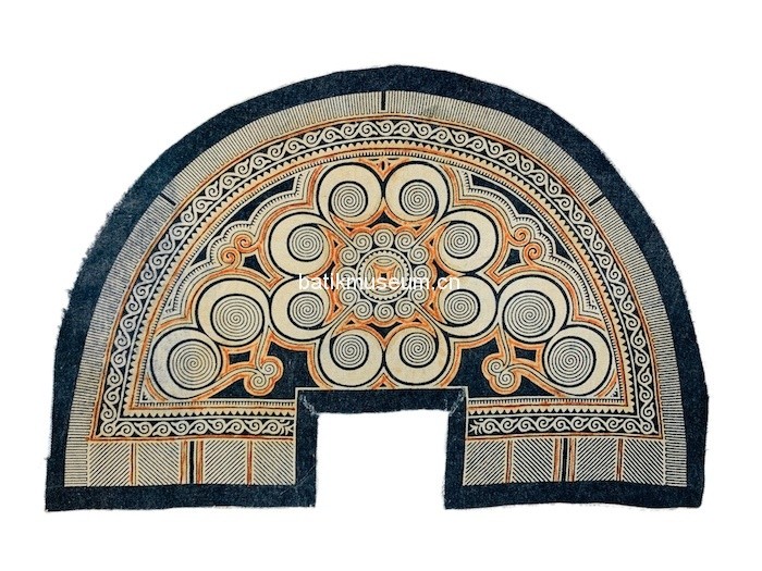 中文名:贵州省黔东南苗族侗族自治州丹寨苗族白领苗旋涡万字斗纹手织布几何纹彩色蜡染片(背部)
