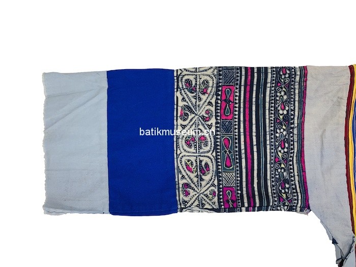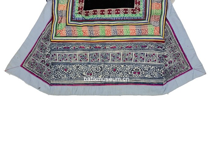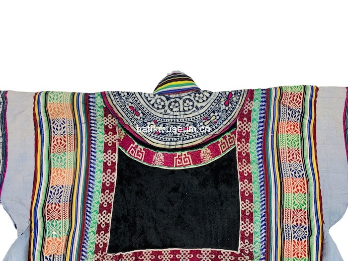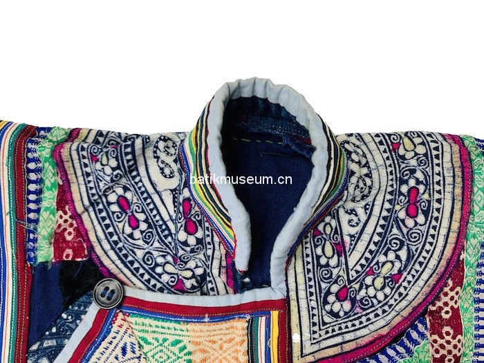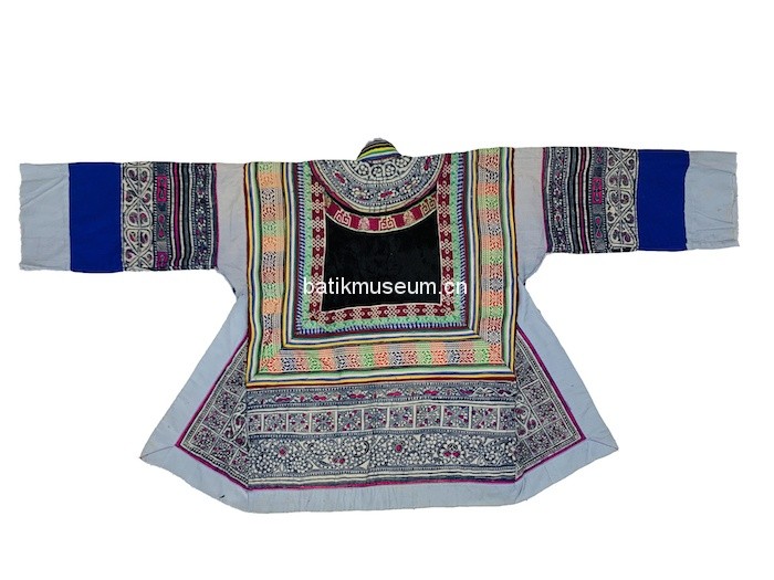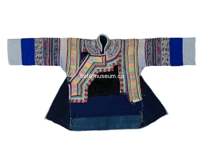 中文名:贵州省毕节市大方苗族变形斜角云花卉几何纹彩色蜡染手织麻布大襟右衽立领长袖衣(儿童)