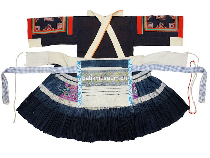 简述:本套藏品为上衣、裙子、围腰。其中上衣主要其中衣前长41厘米,后长60.5厘米,下宽47.5厘米,展开通袖全长129.5,袖宽24.5,形制为古老的贯首八字领翻长袖衣,前短后长。为青染棉布质地,单层无里。上衣袖子装饰一黑底大八角星纹正方形,边框以红绿线装饰,大正方形由五个正方形、四个三角形组成,其纹样由多个角纹组合成的八角星纹。衣前片青布无装饰,为青染棉布。白色长领交叉与胸前。衣背正中装饰一黑底大八角星纹正方形,边以红绿红布条为框,内由挑花制作五个正方形和三个三角形组成。绣着三个万字符的白色短领交叉于后背上,与后背图案相映成,组合成八角星图案。后背下摆转装饰长方形贴布绣,内有多个贴布小正方形。