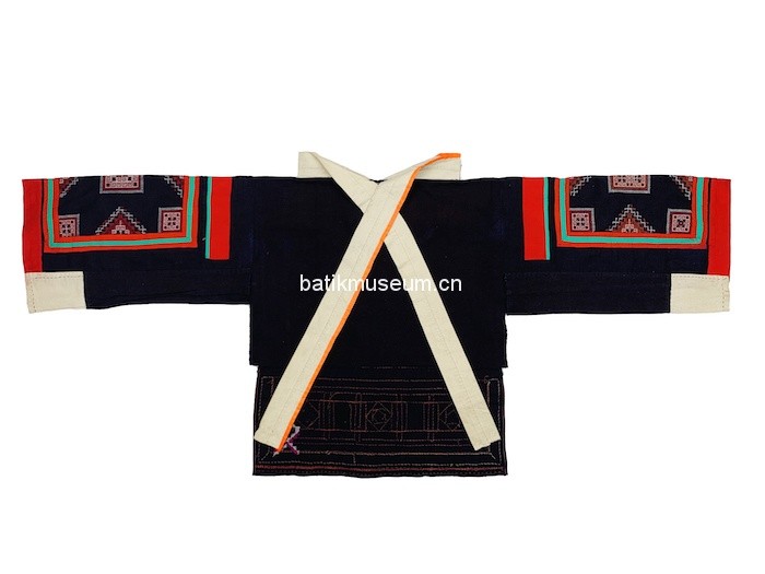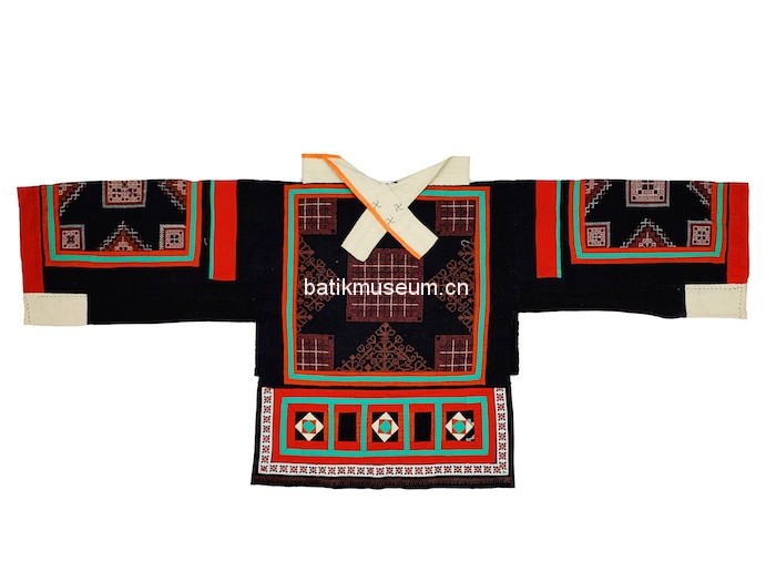 中文名:贵州省贵阳市乌当区苗族印苗八角星心形角纹挑花八字领贯首长袖衣/八角花几何纹蜡染贴布百褶裙/角形八角花漩涡万字几何花卉纹蜡染贴布围腰