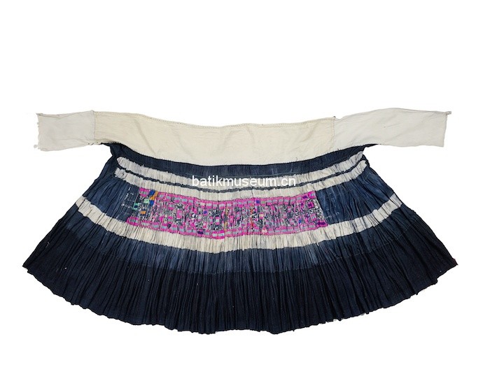 贴布蜡染百褶裙裙高68厘米,裙子为单片式结构,由后向前围裹穿着,结带缠绕系于腰间。塔式裙摆分上中下三段,上段为白色棉布,中段为蜡染贴布,下段麻布青染布。蜡染区中间区域为蜡染贴布绣,其上有两段白色蜡染条,其下有一条较宽白色蜡染条。