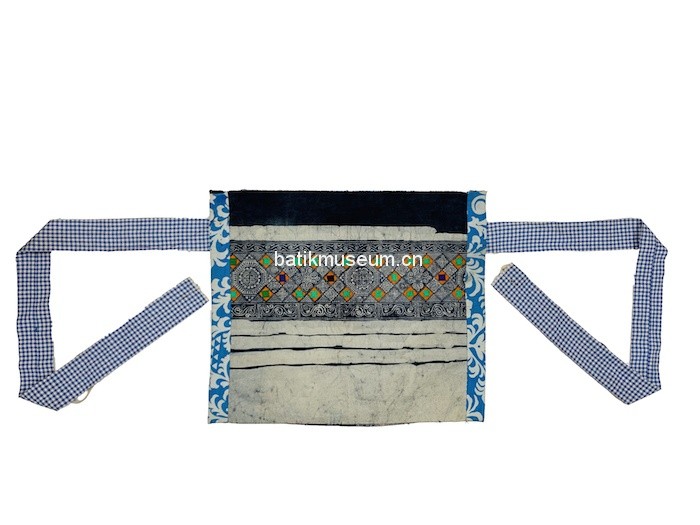 围腰长46.5厘米,宽39.5厘米,绳带以及围腰片全长174厘米,围腰片区域装饰贴布绣蜡染,中间部分有八角花纹、万字纹、漩涡纹等几何花卉纹,菱形区域以黄绿布块贴布装饰。其他区域多为白底蜡染。[erphpdown]