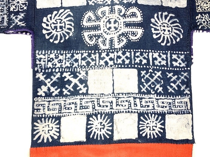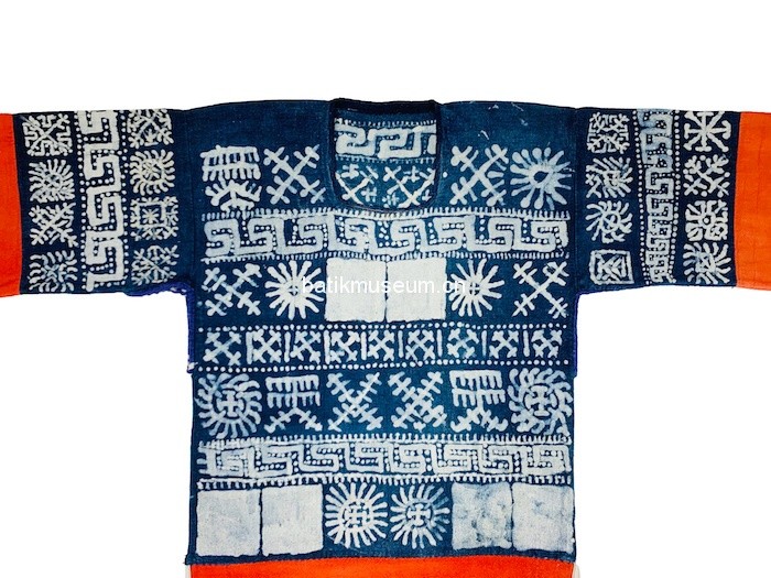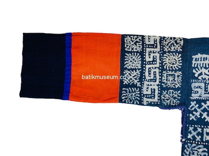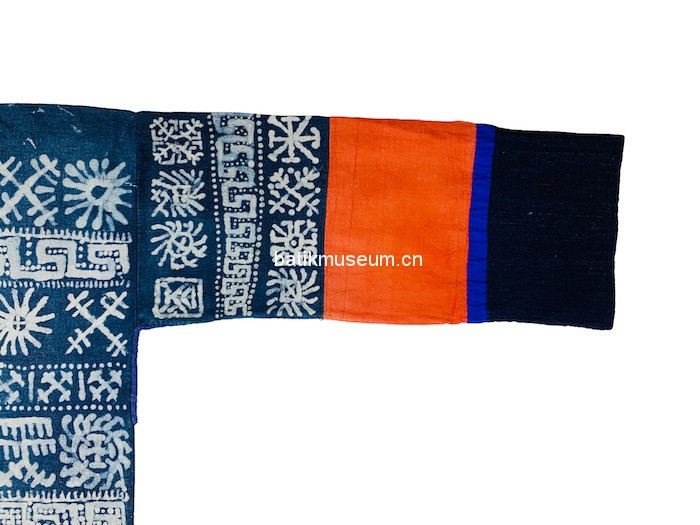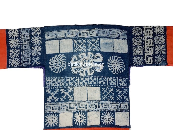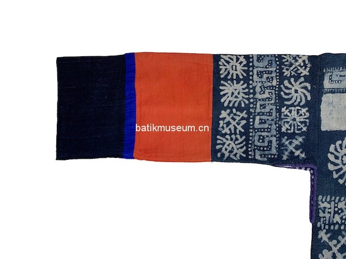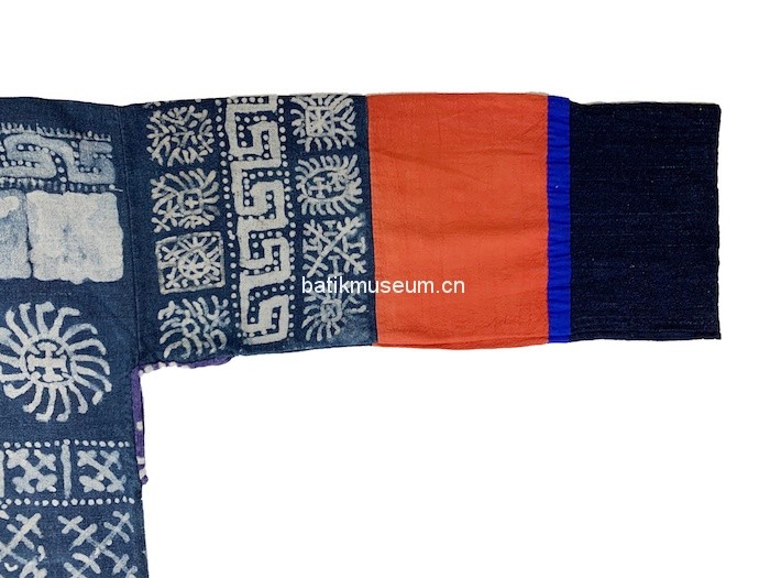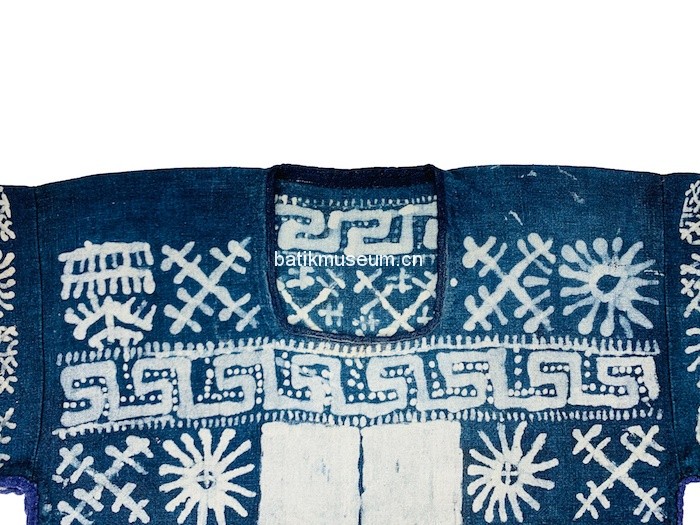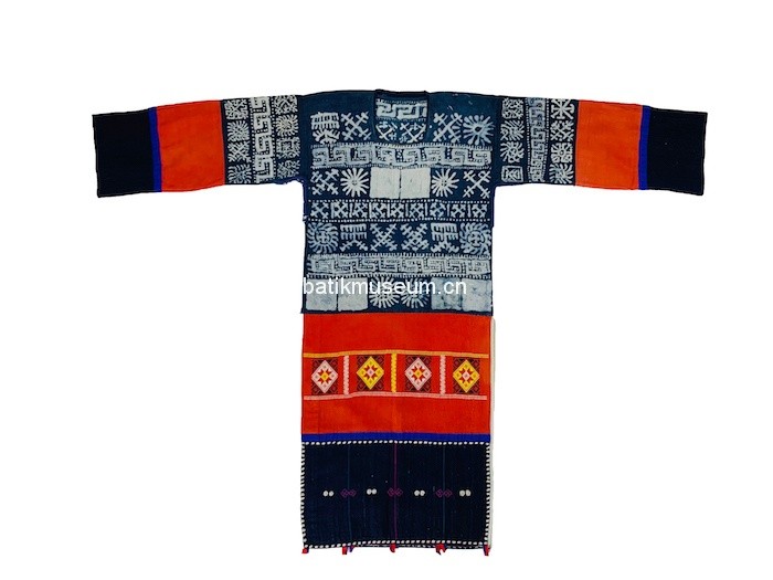 该衣形制为古老的贯首长袖衣,整体造型呈T形,方形领口,直筒形衣身,腰臀处两侧至底摆呈敞开状,下身配穿高脚裤。衣身为蜡染棉布质地,单层无里。上衣袖子装饰三条几何纹蜡染,中段装饰红色万字纹织锦,再以蓝色细布条结尾,留出青染黑色平纹麻布袖口。衣前片上段使用日月星辰几何纹装饰,中下段使用红色万字纹织锦为底,三正方形八角花织锦横条装饰于中间部位。最下段被一段蓝色布条间隔开,使用袖口同样布料和颜色,即以青染黑色平纹麻布为底,四周以几何纹样金属钉片装饰,钉片被白色麻线固定黑布上。整个下段呈横长方形,被两条蓝线和一条紫红色紫线分割开来,三条线中间处各有两个田字格菱形图案,分区成四个竖条长方形,每个竖条长方形中间有一对几何纹样钉片装饰。衣后片装饰与前片一致,只有蜡染纹样不同。