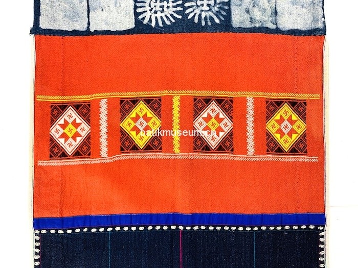 简述:本件藏品为广西彝族贯首衣,长116.5厘米,宽51厘米,展开通袖全长161.5厘米,袖宽25厘米。该衣只在跳弓节时穿着,该彝族支系喜多层叠穿,所穿衣服越多,表明越富有。此外,四十岁以上的妇女正常死亡时也穿着入棺。