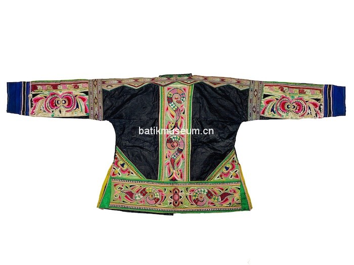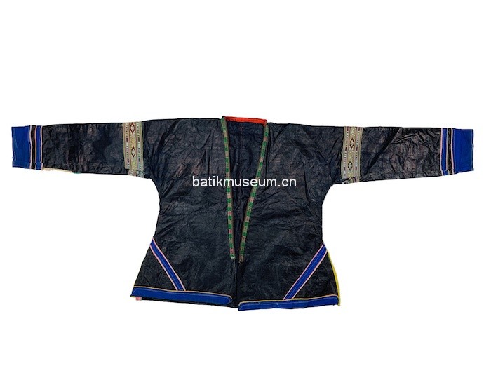 中文名:贵州省黔东南苗族侗族自治州榕江苗族蜈蚣龙鱼花几何纹刺绣万字几何纹织锦亮布无领无扣长袖对襟衣