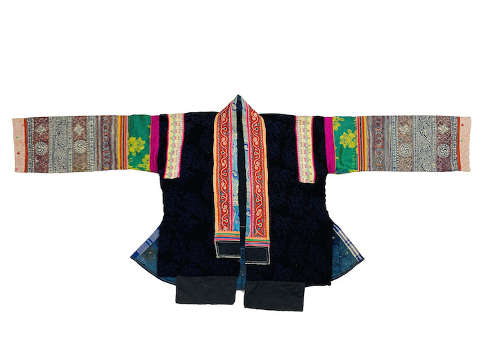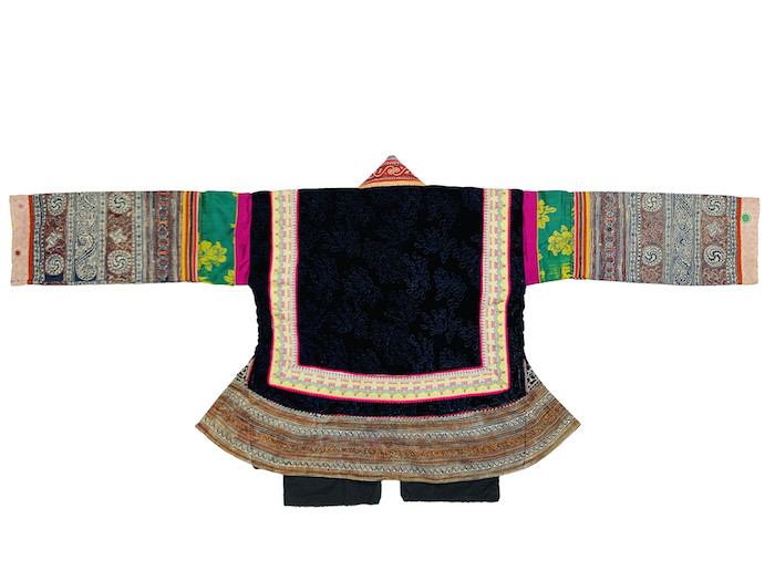 中文名:贵州省毕节市黔西县苗族抽象太阳鸟几何纹彩色蜡染真丝刺绣对襟衣